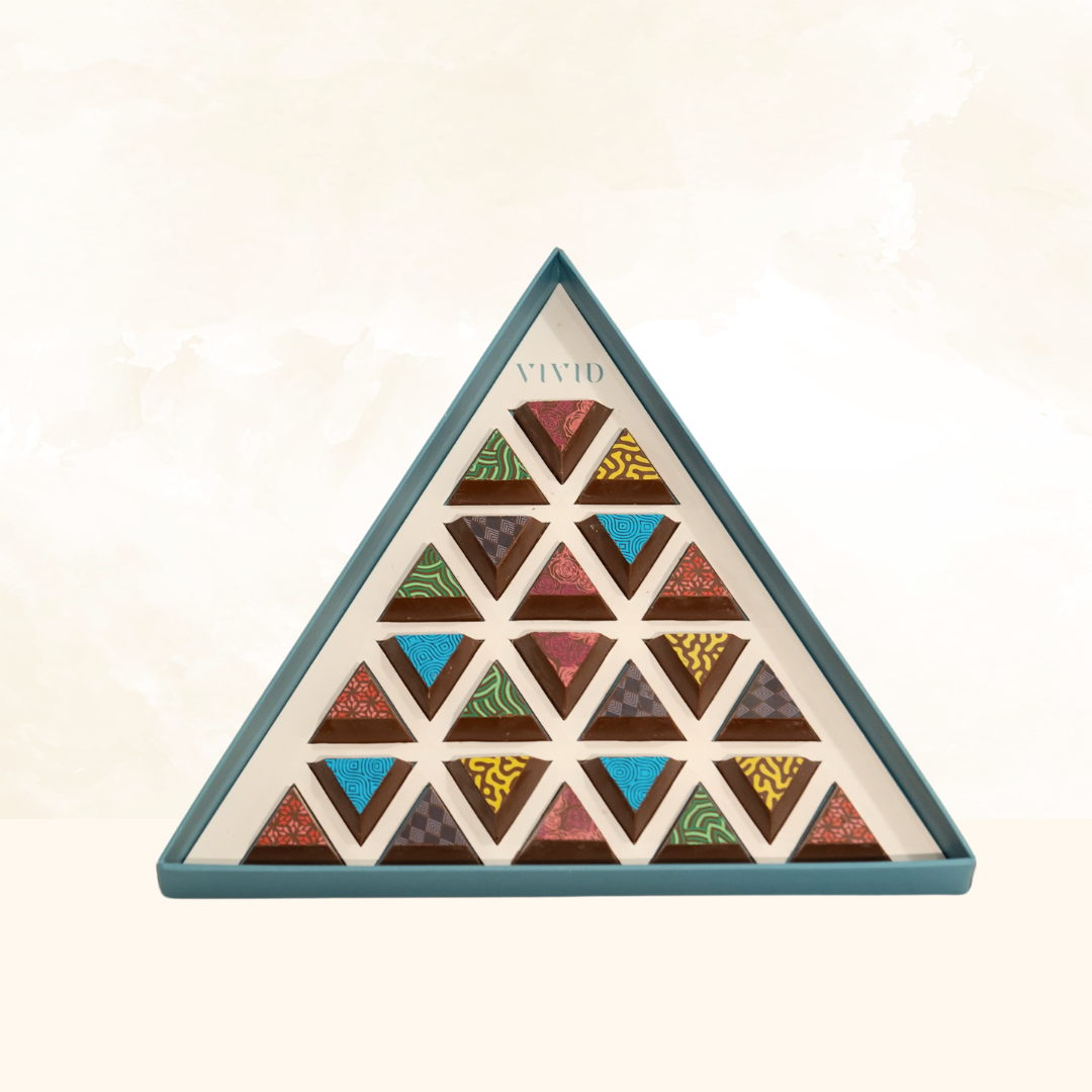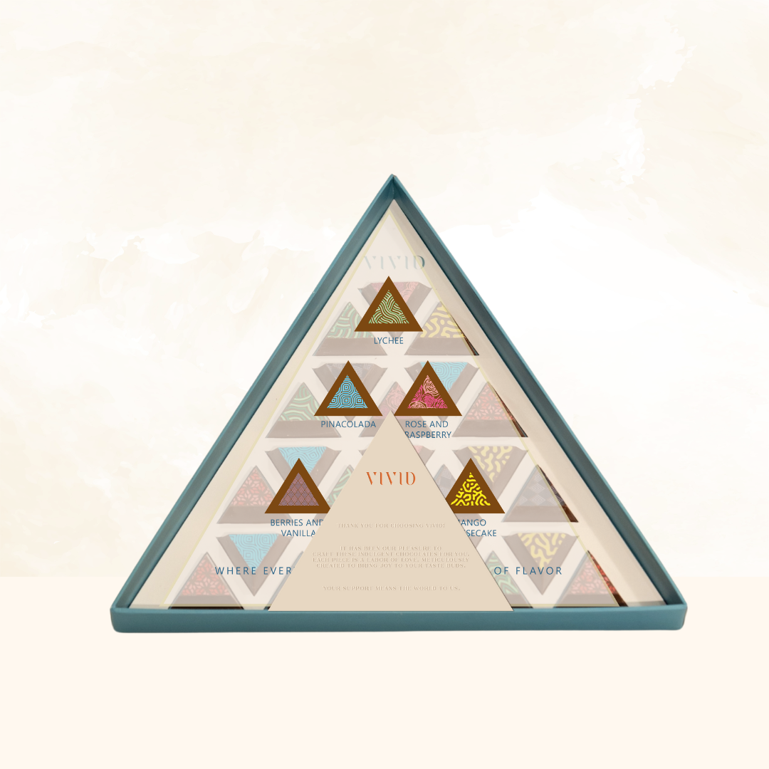 Vivid Summer Box, features Pinacolada, Pistachio & Pomegranate, Lychee, Rose & Raspberry, Mango Cheesecake, Berries & Vanilla. Each box contains 24 pieces, with 4 pieces of each flavor.